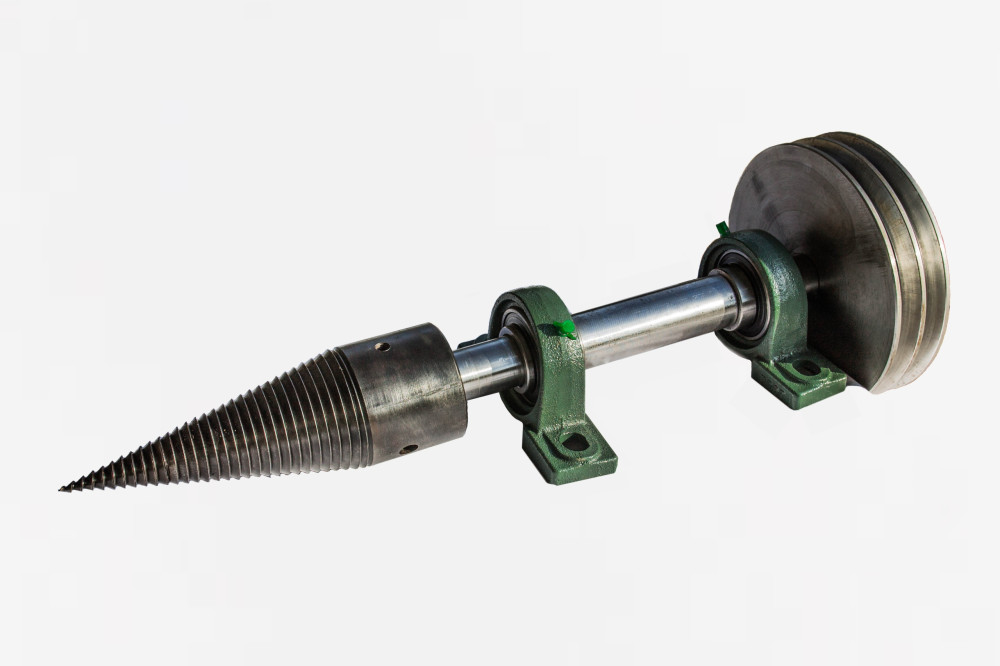 Wałek w najbardziej newralgicznym miejscu ma średnice 35mm oraz wykonany jest z twardego materiału 42CrMo4+QT. Daje to pewność ze nie ma możliwości skrzywienia wałka nawet podczas łupania najgrubszych twardych klocków drewna, co ma miejsce przy wałkach o niższych średnicach.