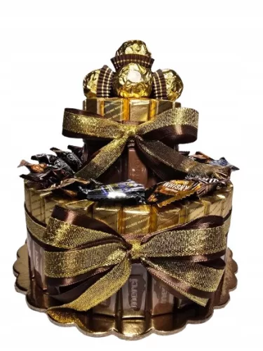 Na tej aukcji polecam piętrowy Nibytorcik z z czekoladek Merci, pralin Fererro Rocher oraz czekoladowych cukierków Beember.