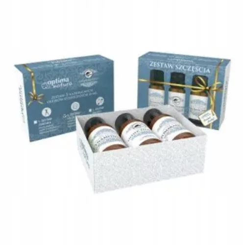 Zestaw naturalnych olejków eterycznych do aromaterapii. Zestaw szczęścia to trzy rozgrzewające 100% naturalne olejki eteryczne 10 ml Optima Natura w eleganckim pudełeczku prezentowym. To niebanalny i praktyczny upominek, który idealnie sprawdzi się w aromaterapii.