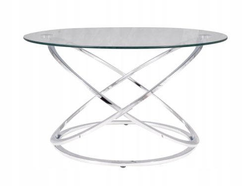 Ekskluzywna ława Eos B, blat tego pięknego mebla stanowi okrągłe transparentne szkło o średnicy 80 centymetrów umieszczone na metalowej podstawie w kolorze chromu. Niesamowity efekt estetyczny ławy nadaje blasku salonom zarówno w stylu Art Déco, jak i glamour.