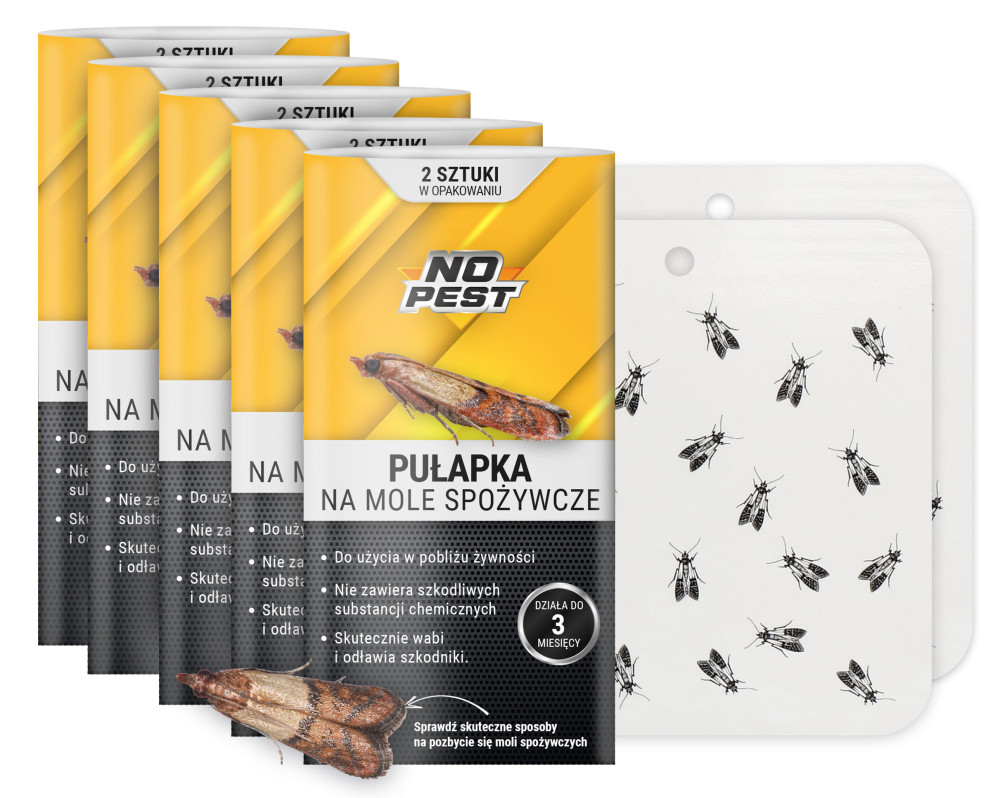 Uniwersalna pułapka lepowa uznanej marki No Pest to najlepszy i najbezpieczniejszy sposób wyeliminowania moli spożywczych. Pułapka posiada feromony każdego gatunku mola kuchennego, dzięki temu skutecznie wabi każdego szkodnika. Wabiące feromony pułapka uwalania aż przez 3 miesiące jednak lep działa znacznie dłużej.