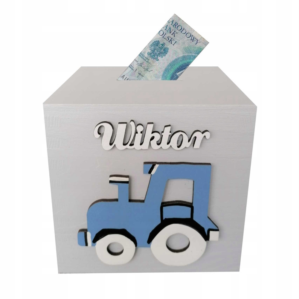 Z przodu skarbonki znajduje się ręcznie malowany przez naszych plastyków dekor oraz drewniany napis z imieniem dziecka.