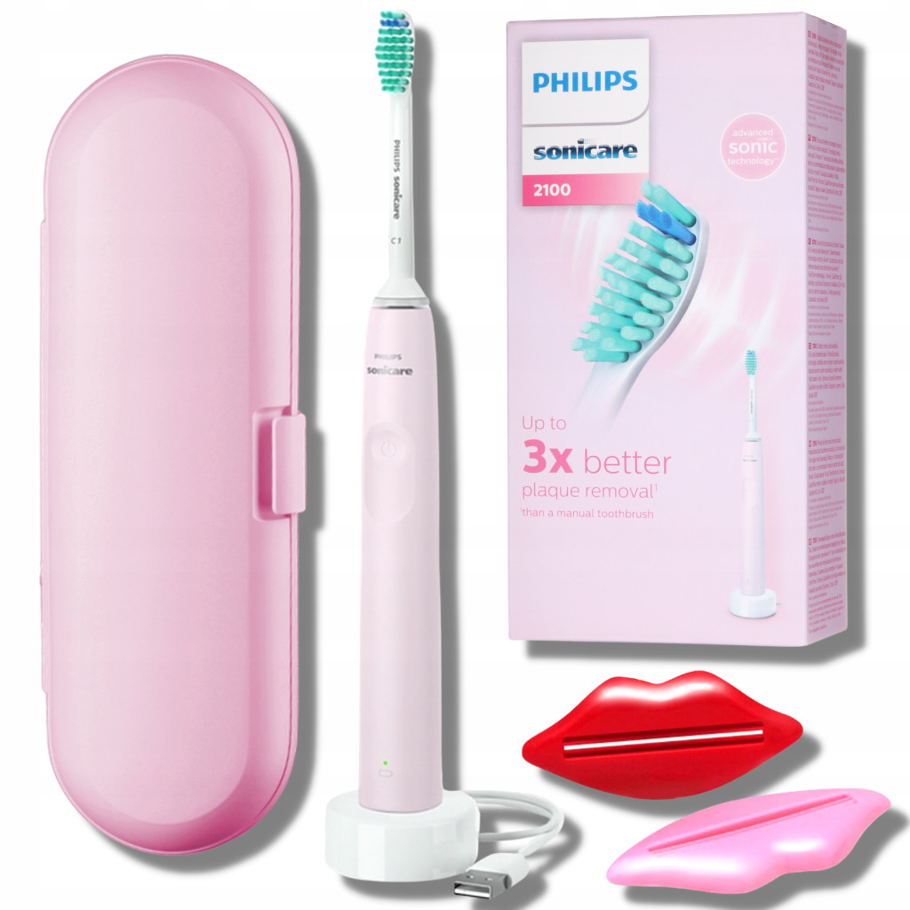 • W skład zestawu wchodzą: szczoteczka elektryczna z wbudowanym akumulatorem, podstawka do ładowania, oryginalna końcówka dołączona przez producenta, 2 wyciskacze do pasty, oryginalne opakowanie oraz instrukcja obsługi.