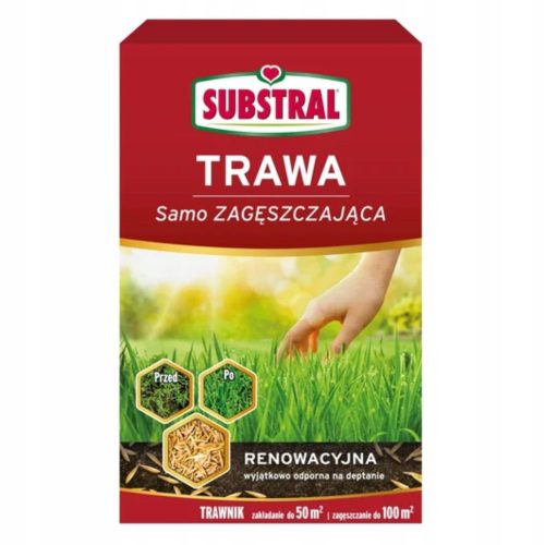 Substral trawa samozagęszczająca Renowacyjna. Szybko zadarniania wolne powierzchnie i ubytki na trawniku. Tworzy zwartą, gęstą i bujną darń. Zapewnia wysoką odporność trawnika na deptanie i intensywne użytkowanie, intensywny wzrost i ciągłe odmładzanie się trawnika. Tworzy naturalną barierę dla mchu i chwastów na trawniku. Bardziej odporna na przemarzanie - trawnik lepiej przetrzyma zimę. Można kosić trawę znacznie niżej - nisko międzywęźla. Kiełkuje w niższych temperaturach.