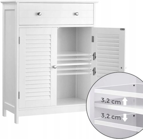 Biała, lakierowana szafka łazienkowa Vasagle to doskonałe rozwiązanie do każdej łazienki. Wykonana z wytrzymałej płyty MDF (klasa E1), dzięki czemu jest odporna na pleśń i wilgoć oraz jest łatwa w czyszczeniu. Wszystkie przybory i akcesoria łazienkowe, zwłaszcza te, których nie chcemy trzymać na wierzchu, są chronione przed wodą i kurzem. Za ozdobnymi drzwiczkami z metalowymi, chromowanymi gałkami kryje się pozioma półka, którą można umieścić na pięciu różnych wysokościach, dzięki czemu możemy przechowywać w szafce przedmioty różnej wielkości. Dodatkową przestrzeń do przechowywania i segregacji zapewnia pojemna szuflada. Szafka nie tylko wprowadzi ład i porządek w Twojej łazience, ale dodatkowo nada jej eleganckiego stylu.