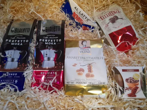 Wielbiciele włoskich smaków znajdą w tym zestawie doskonałe kawy mielone Bialetti, a pralinki Feletti, czy też kruche ciasteczka Amarettini będą idealnym dopełnieniem aromatycznej kawy.