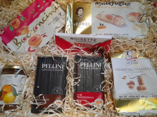 Kosz z 2 rodzajami mielonej kawy Pellini wypełniony jest włoskimi słodyczami. Doskonałe kruche ciasteczka Amarettino, czy też Millefoglie to idealna przekąska do porannego cappuccino czy też popołudniowego espresso.