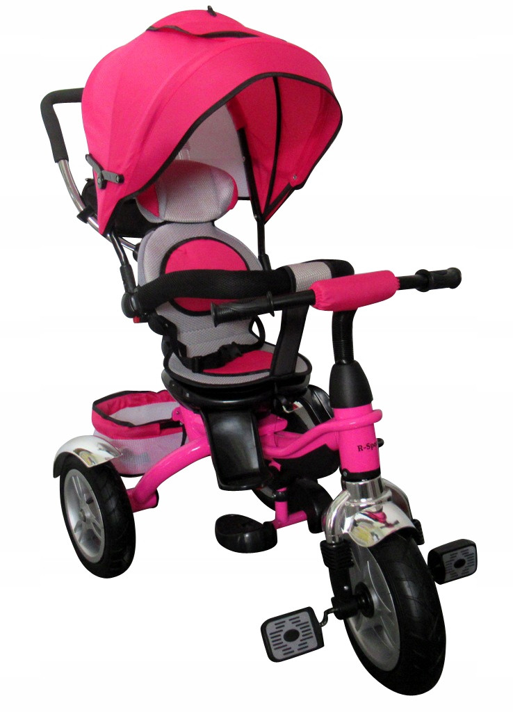 1. Rowerek z pełnym wyposażeniem: Budka chroni przed słońcem, poręcze i pasy zabezpieczają dziecko, rodzic steruje tylną rączką (rączka steruje kierownicą dzięki czemu rowerek jest skrętny),