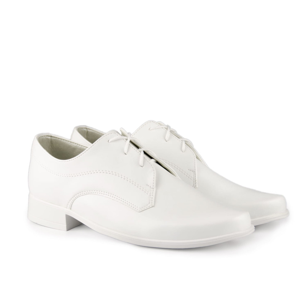 Klasyczne, białe buty komunijne dla chłopca. Buciki dobrze wyprofilowane, dzięki czemu są bardzo wygodne. Zewnątrz obuwie wykonane z miękkiej skórki ekologicznej, natomiast wkładka ze skóry naturalnej.
