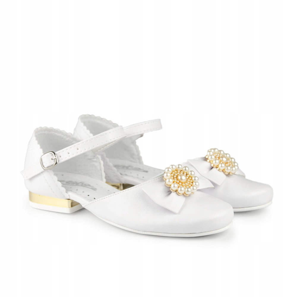 Eleganckie, białe buty komunijne dla dziewczynki, zapinane na regulowany paseczek ze sprzączką. Buciki dobrze wyprofilowane, dzięki czemu pewnie trzymają się stopy. Model na delikatnym obcasiku o wysokości 1,5 cm, w kolorze złotym. Uroku dodaje im kokarda ze złotą ozdobą, zdobioną pięknymi perełkami. Zewnętrzna część obuwia wykonana jest ze skóry ekologicznej, natomiast zapiętek i wkładka ze skóry naturalnej.