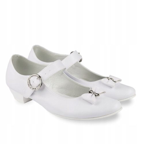 Eleganckie białe buty komunijne dla dziewczynki. Buciki dobrze wyprofilowane, dzięki czemu są bardzo wygodne. Dodatkowo posiadają paseczek z przodu dla lepszego utrzymania stopy. Model na delikatnym obcasiku o wysokości 2,5 cm, w kolorze białym. Uroku dodaje im kokarda na przodzie cholewki. Zewnętrzna część obuwia wykonana jest ze skóry ekologicznej, natomiast wkładka ze skóry naturalnej. Klasyczne baleriny idealnie sprawdzą się zarówno w dniu Pierwszej Komunii Świętej jak i w podczas innych uroczystości.
