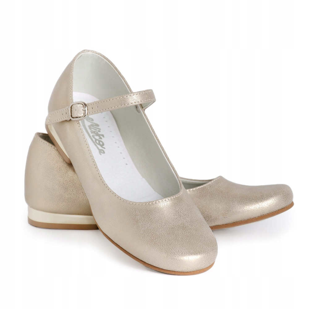 Eleganckie, wsuwane, złote buty wizytowe dla dziewczynki. Buciki dobrze wyprofilowane, dzięki czemu pewnie trzymają się stopy. Dodatkowo posiadają paseczek, którego można użyć z przodu dla lepszego utrzymania stopy lub z tyłu jako ozdobę. Model na delikatnym obcasiku o wysokości 1,5 cm, w kolorze złotym. Zewnętrzna część obuwia wykonana jest ze skóry ekologicznej, natomiast wkładka ze skóry naturalnej. Klasyczne baleriny idealnie sprawdzą się zarówno jako przebranie w dniu Pierwszej Komunii Świętej jak i w podczas innych uroczystości i nie tylko.