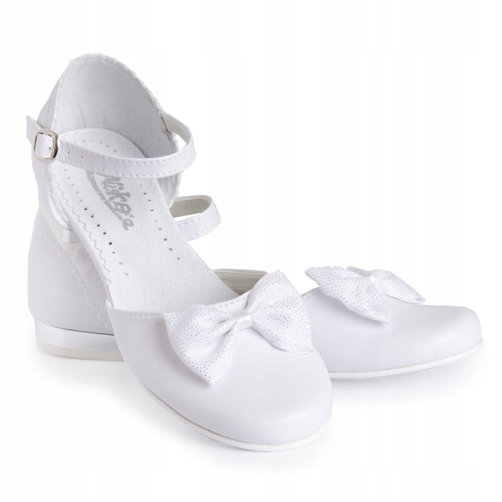 Eleganckie białe buty komunijne dla dziewczynki. Fason z zapiętkiem i regulowanym paseczkiem. Buciki dobrze wyprofilowane, dzięki czemu są bardzo wygodne. Model na delikatnym obcasiku o wysokości 2,5 cm, w kolorze białym. Uroku dodaje im biała kokarda. Klasyczny model, który będzie pasował do większości sukienek lub alb. Zewnętrzna część obuwia wykonana jest ze skóry ekologicznej, natomiast zapiętek i wkładka ze skóry naturalnej.