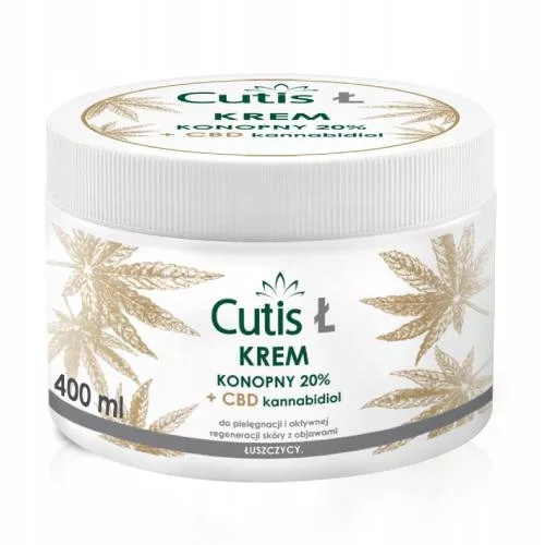 CUTIS Ł - ŁUSZCZYCA krem konopny 20% + CBD to aktywny emolient na bazie oleju konopnego o unikalnej formule, wzbogaconej gwarantowaną zawartością CBD - kannabidiolu, substancji aktywnej o silnych właściwościach przeciwzapalnych, przeciwbólowych, przeciwalergicznych i antybakteryjnych. Bogata formuła preparatu, oparta na wyselekcjonowanych i skutecznych substancjach, działa zarówno na powierzchni skóry, jak i w jej głębokich warstwach, dzięki czemu redukuje objawy wielu dermatoz, takich jak m.in.: łuszczyca.