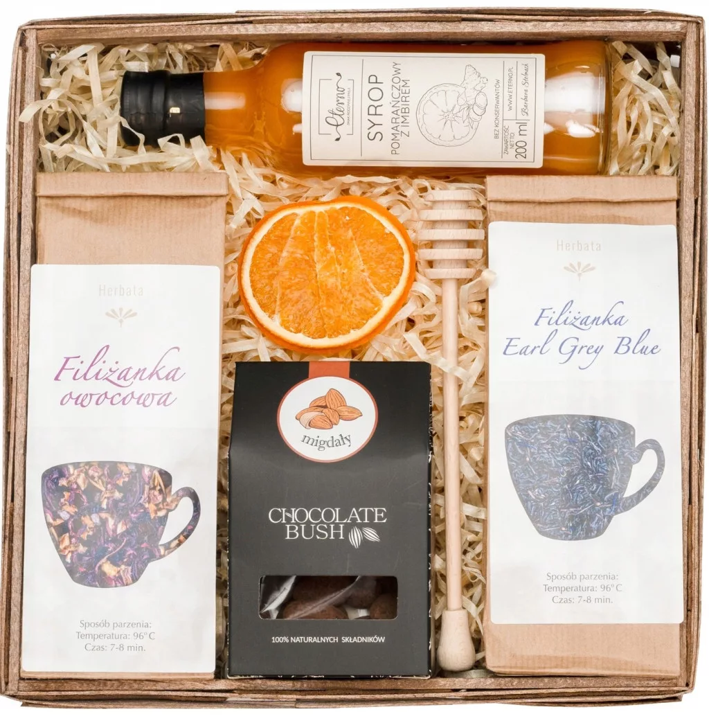 Całość zapakowana w ekologiczny kosz ręcznie pleciony z łuby sosnowej, wypełniony pachnącą wełną drzewną.