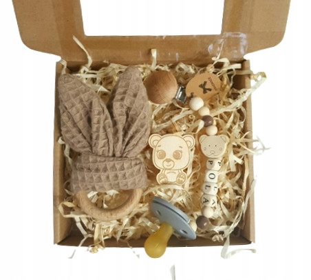 • zawieszkę do smoczka (wykonaną własnoręcznie z zastosowaniem koralików z drewna bukowego oraz silikonu spożywczego. Istnieje możliwość wykonania zawieszki z imieniem lub z samych koralików, bez imienia). Zawieszka wykonana zgodnie z normą DIN EN 12586:2011. Do każdego zamówionego zestawu zostanie dołączona instrukcja użytkowania zawieszki do smoczka. Zestaw nie zawiera smoczka