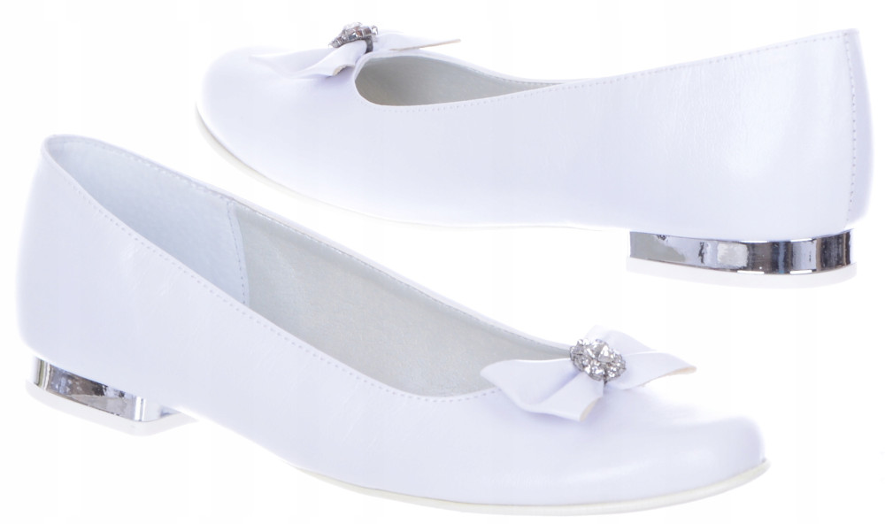 Eleganckie, wygodne i niezwykle piękne czółenka/baleriny komunijne. Cholewka wykonana została z miękkiej skóry ekologiczne, która zapewnia stopie komfort podczas chodzenia. Buty posiadają ponadto skórzaną profilowaną wkładkę. Lekkie, bardzo wygodne! Wykonane z dbałością o szczegóły. Buciki na białym, niskim obcasie z wstawką w kolorze srebrnym. Zdobione eleganckimi białymi kokardkami z srebrną ozdobą. Doskonale sprawdzą się podczas uroczystych okazji. Produkt w całości wykonany w Polsce przez firmę MIKO Doskonałe do pierwszej komunii świętej