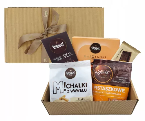 Każda okazja jest doskonała by wyrazić wdzięczność. A cóż sprawdzi się lepiej jak nie eleganckie pudełko pełne doskonałych słodkości? Zestaw prezentowy będzie doskonałym prezentem na Dzień Dziadka, Dzień Babci, Dzień Matki, Walentynki oraz inne okoliczności. W środku znajdziesz 5 produktów Wawel, w tym: bombonierkę Kasztanki 330g, Michałki z Wawelu Białe 245g, karmelki Fistaszkowe 105g oraz czekolady - Gorzka Premium 90% cocoa oraz Peanut Butter.