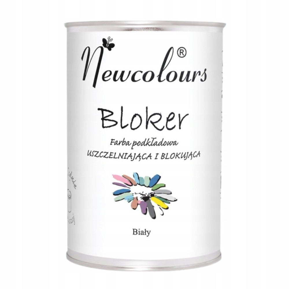 Bloker to bardzo mocno kryjąca biała farba, która pokryje trudne plamy (rdza, zacieki, kredki świecowe, itp.). Może być stosowany jako warstwa podkładowa pod Farby Newcolours na odnawianych powierzchniach - szafkach, meblach, drzwiach itp.