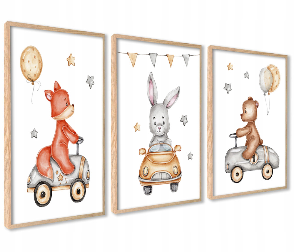 Zestaw 3 plakatów przedstawia misia, liska i zajączka. Znakomita dekoracja do pokoju dziecięcego.