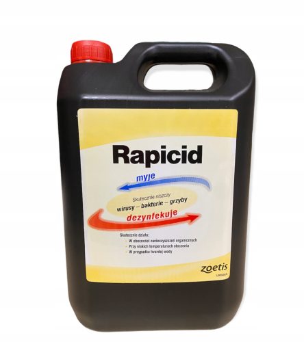 Rapicid to środek na bazie jodu w 5 litrowym baniaku przeznaczony do dezynfekcji obiektów inwentarskich. Ze względu na szeroki spektrum działania Rapicid może pełnić również rolę detergentu i służyć do mycia różnego rodzaju powierzchni. Zawartość czynnych związków zawartych w dezynfektancie pozwala łatwo wniknać w powierzchnie porowate i trudno dostępne. Preparat charakteryzuje się niską toksycznością - można stosować go w obecności zwierząt. Środek nie podrażnia dróg oddechowych oraz nie wywołuje alergii u ludzi i zwierząt