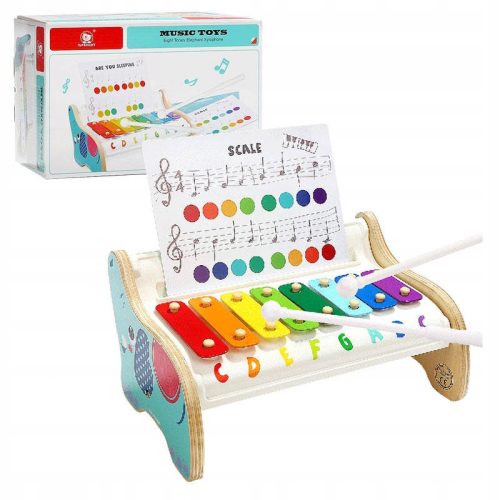 Drewniany ksylofon z 8 kawałkami żelaznej tęczy i 2 pałeczkami, to kompletna linia instrumentów muzycznych z małym niebieskim słonikiem po obu stronach.