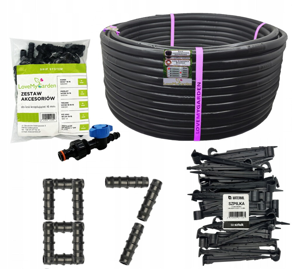 W naszym zestawie znajdziesz niezbędne elementy do efektywnego nawadniania Twojego ogrodu. Z dumą prezentujemy linię kroplującą o długości 50m, średnicy 16mm i rozstawie kroplowników co 33cm.