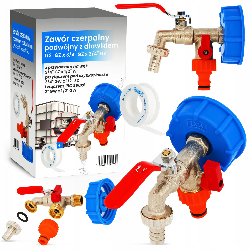 Zawór czerpalny podwójny z dławikiem 1/2'' GZ x 3/4'' GZ x 3/4'' GZ z przyłączem na wąż 3/4'' GZ x 1/2'' W, przyłączem pod szykozłączke 3/4'' GW x 1/2'' SZ i złączem IBC S60x6 2'' GW x 1/2" GW