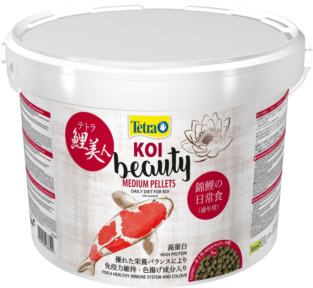 Granulki Tetra Koi Beauty Medium zapewniają karpowi koi wszystkie składniki odżywcze, których potrzebują do długiego i zdrowego życia. Odpowiedni dla gatunku skład pokarmu i najwyższa jakość zapewniają najlepsze warunki dla jasnych kolorów i zdrowych ryb. Kluczowe składniki odżywcze, takie jak wysoka zawartość białka, która jest niezbędna do wzrostu, a także witaminy i kwasy tłuszczowe omega-3 zapewniają koi wystarczającą ilość energii do zdrowego wzrostu. Beta-glukan pomaga karpowi koi budować zdrowy układ odpornościowy od najmłodszych lat, co skutecznie chroni go przed chorobami. Pokarm zawiera także węglowodany (inne kluczowe źródło energii), które są idealnie dostosowane do potrzeb karpia koi. Jednocześnie suplementy, takie jak beta-karoten (występujący w marchwi i słodkich ziemniakach), wzmacniają szczególnie żywe kolory ryb. Ponieważ wysokiej jakości składniki w znacznym stopniu przyczyniają się do dobrego przetwarzania żywności i są wysoce przyswajalne, pomagają również utrzymać czystość wody w stawie i zapewniają dobrą jakość wody. Podsumowując, Tetra Koi Beauty Medium to zbilansowany pokarm dla karpi koi (od 20 cm długości).