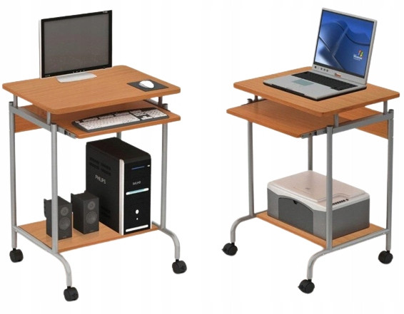 Praktyczne oraz funkcjonalne biurko komputerowe. Do pracy zarówno przy notebooku jak i małym komputerze klasy PC. Idealne zarówno do domu jak i biura czy pracowni. Niezwykle mobilne dzięki podstawie wyposażonej w cztery kółka  (dwa z hamulcem). Główny blat biurka zapewnia wystarczająco miejsca do pracy przy notebooku lub małym komputerze PC. Wysuwana półka ułatwia dostęp do klawiatury oraz zapewnia oszczędność miejsca na głównym blacie. Szyny półki na klawiaturę przykręcane do metalowej ramy gwarantują trwałość i wytrzymałość. Dolna, przestronna półka pomieści drukarkę, komputer PC lub inne urządzenia i materiały Blat i półki wykonane z laminowanej płyty MDF Rama wykonana z malowanej proszkowo stali.
