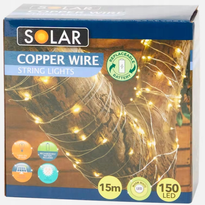 Miedziany łańcuch świetlny ze 150 światełkami LED na energię słoneczną włącza się automatycznie o zmierzchu i tworzy nastrojowy efekt.