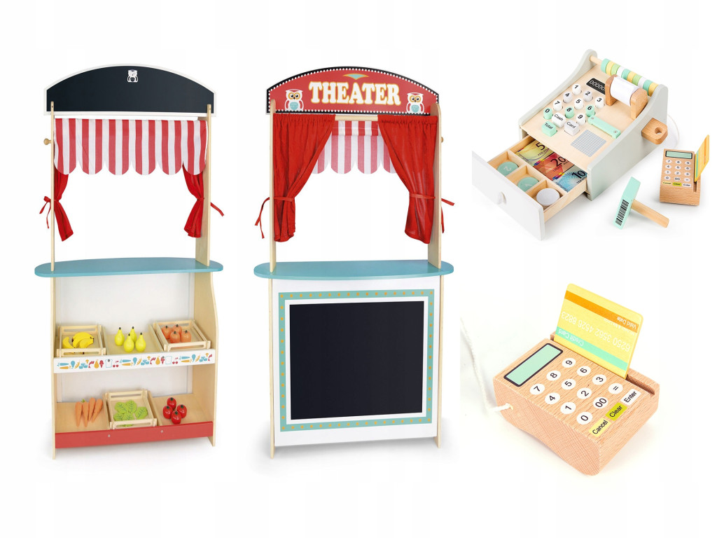 Duży drewniany teatrzyk i sklep 2 w 1. Idealna zabawka, która uczy i bawi. Teatrzyk pomoże rozwinąć wyobraźnię Twojego dziecka, a sklep pomoże w nauce liczenia i dysponowania pieniędzmi.