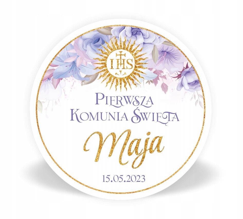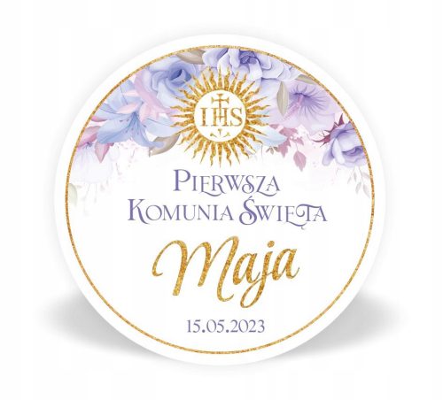 Aukcja dotyczy pakietu 35szt personalizowanych okrągłych naklejek ciętych po obrysie (średnica 45mm) na podłożu: papier samoprzylepny pół-błysk.
