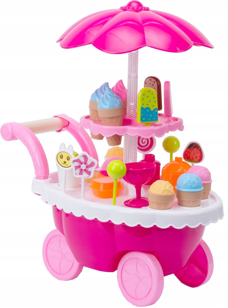 Lodziarnia, wózek ze słodyczami idealnie się nada do odtwarzania ról i sytuacji z życia wziętych z którymi dzieci się spotykają podczas codziennych zakupów z rodzicami. Przeznaczona jest dla dziewczynek.