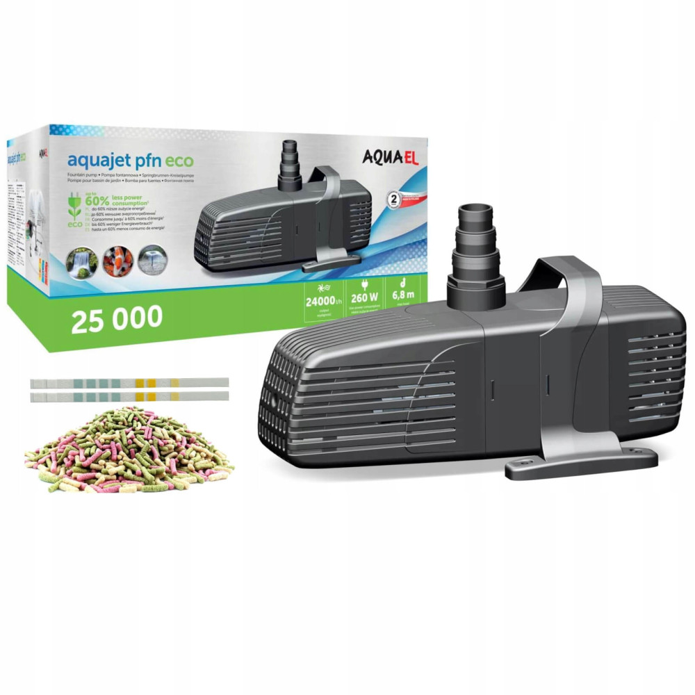 Aquael AquaJet PFN-25000 Eco pompa do oczka wodnego, zasilająca filtr, wysoką kaskadę lub fontannę. Pompę charakteryzuje rewelacyjny stosunek wydajności 24 000 l/h do mocy 260 W. Do zestawu dołączone są gratisy – pokarm Koi Premium Mix 1 l oraz 2 testy 6w1.