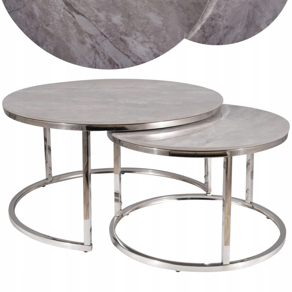 Zestaw ław Portafino B to 2 ceramiczne stoliki kawowe w chromowanej ramie. Ten oryginalny zestaw doskonale współgra z eleganckim i nowoczesnym wnętrzem. Stolik idealnie wpisuje się w styl glamour, który hołduje błysk oraz srebro. Blaty ław wykonane są z ceramiki w efekcie szarego marmuru. W skład zestawu wchodzą dwa okrągłe stoliki kawowe, które możemy ustawić w dowolnej konfiguracji, w różnych aranżacjach. Stoliki mogą stać obok siebie, można też z łatwością ułożyć jeden pod drugim. Dzięki temu możemy zmieniać stylizację wnętrza w prosty sposób.