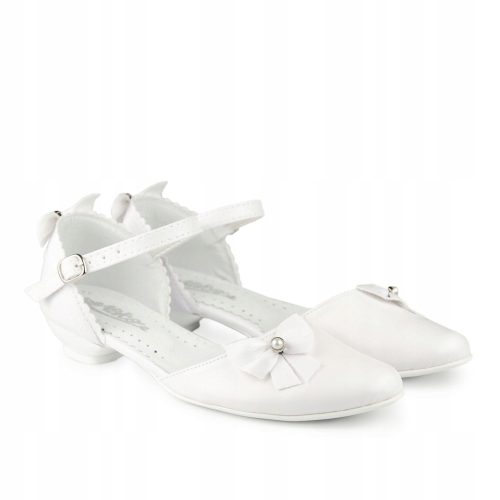 Eleganckie białe buty komunijne dla dziewczynki. Fason z zapiętkiem i regulowanym paseczkiem. Buciki dobrze wyprofilowane, dzięki czemu są bardzo wygodne. Model na delikatnym obcasiku o wysokości 2,5 cm, w kolorze białym. Uroku dodają mu kokardy przyozdobiona perełką, które umiejscowione są na przodzie cholewki oraz dodatkowo na zapiętku. Bardzo dziewczęcy model, który będzie pasował do większości sukienek oraz alb. Zewnętrzna część obuwia wykonana jest ze skóry ekologicznej, natomiast zapiętek i wkładka ze skóry naturalnej.