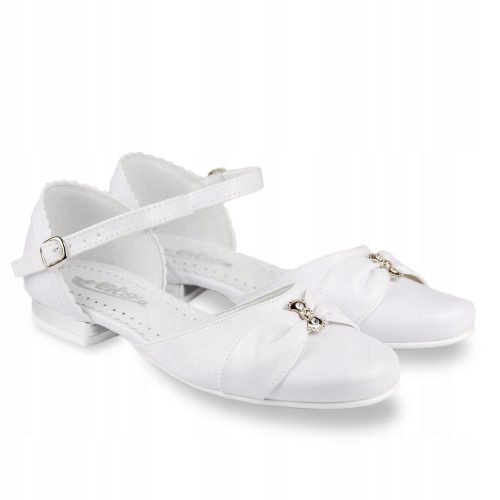 Klasyczne, białe buty komunijne dla dziewczynki, zapinane na regulowany paseczek ze sprzączką. Buciki dobrze wyprofilowane, dzięki czemu pewnie trzymają się stopy. Model na delikatnym obcasiku o wysokości 1,5 cm, w kolorze srebrnym. Uroku dodaje im piękna ozdoba z przodu cholewki. Zewnętrzna część obuwia wykonana jest ze skóry ekologicznej, natomiast zapiętek i wkładka ze skóry naturalnej.