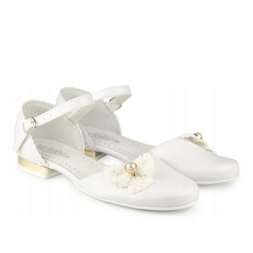 Eleganckie, białe buty komunijne dla dziewczynki, zapinane na regulowany paseczek ze sprzączką. Buciki dobrze wyprofilowane, dzięki czemu pewnie trzymają się stopy. Model na delikatnym obcasiku o wysokości 1,5 cm, w kolorze złotym. Uroku dodaje im piękna, zdobiona koralikami kokarda ze złotą ozdobą. Zewnętrzna część obuwia wykonana jest ze skóry ekologicznej, natomiast zapiętek i wkładka ze skóry naturalnej.