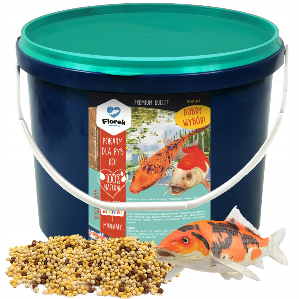 Pokarm wybarwiający, dla wszystkich kolorowych karpi koi, złotych rybek, innych barwnych ozdobnych ryb karpiowatych hodowanych w oczkach wodnych, regularnie podawany wydatnie intensyfikuje czerwone ubarwienie ryb.