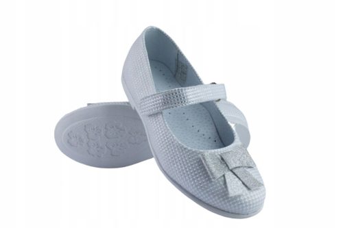 Dziewczęce białe baleriny z najnowszej kolekcji od producenta KORNECKI wykonane ze skóry ekologicznej .Wkładka i wnętrze to  skóra naturalna . Podeszwa to sprężysty termokauczuk który jest elastyczny, wytrzymały i antypoślizgowy. Zapinane są na pasek z rzepem.
