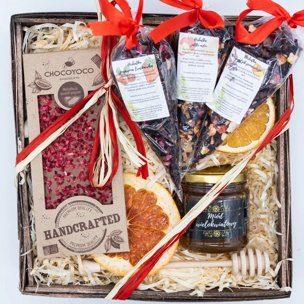 • Wszystkie produkty znajdują się w ręcznie wykonanym koszyku z certyfikowanego (FSC) drewna 25x25x8 cm