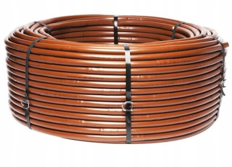 Brązowa linia kroplująca WATERMIL PRO PC z kompensacją ciśnienia. Średnica 16mm, wydajność 2,2 l/h, rozstaw emiterów 0,33m, długość rolki 100mb