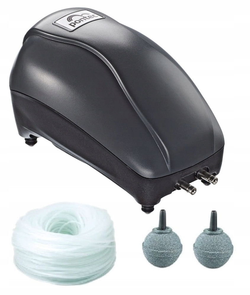 Zestaw zawiera: pompę napowietrzającą, dwa wężyki 4/6mm o długości 5m każdy, 2 kamienie napowietrzające, 1,5 m kabel z wtyczką ze stykiem ochronnym.