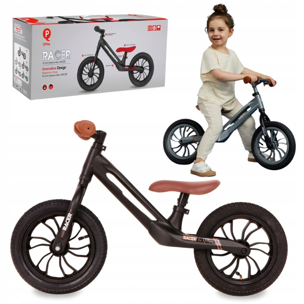 Rowerek biegowy RACER to designerski i solidny produkt, zaprojektowany i wykonany w najnowszej technologii. Stop magnezu wykorzystany w ramie powoduje, że jest ona lekka, ma wysoką wytrzymałość i duży moduł sprężystości. Użyte w rowerku 12” pompowane opony z bieżnikowaniem zapewnią stabilność i bezpieczeństwo na wszystkich nawierzchniach drogowych.