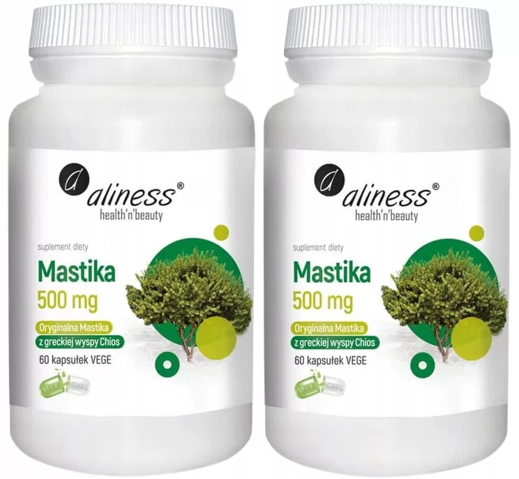 Zestaw Aliness Mastika sproszkowana żywica Pistacia lentiscus 500mg - 2 sztuki - łącznie 120 kapsułek roślinnych wegańskich Helicobacter pylori Refluks Zgaga Wrzody