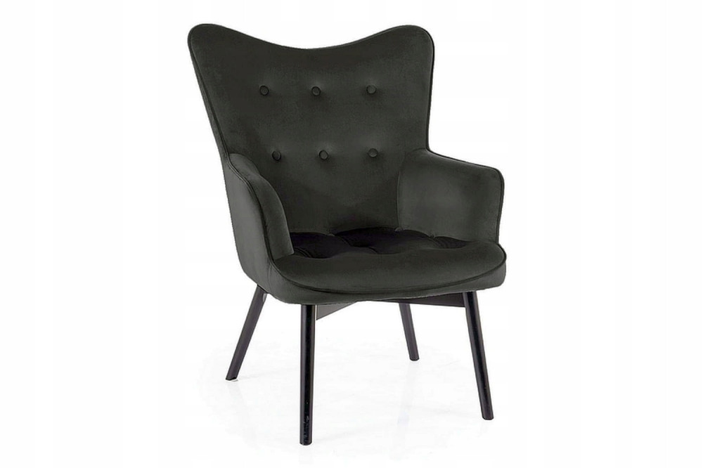 Fotel CARMEN VELVET, to oryginalny mebel do nowoczesnego wnętrza, który doda mu odrobinę klimatu retro. Fotel tapicerowany jest wysokiej jakości tkaniną, miłą w dotyku i charakteryzującą się dużą odpornością na zabrudzenia. Przyozdobione stylowymi guzikami oparcie oraz niebanalna forma, czyni fotel wyjątkowym i stylowym. Wyższe oparcie oraz podłokietniki zapewniają wygodne ułożenie ciała. Wypoczynek jest niezwykle przyjemny i komfortowy. Czarny drewniany stelaż dodaje elegancji i zapewnia pożądaną stabilność.