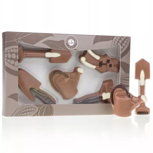 • Zestaw 5 czekoladowych figurek: konewka, grabki, łopata, szpadel i sekator.