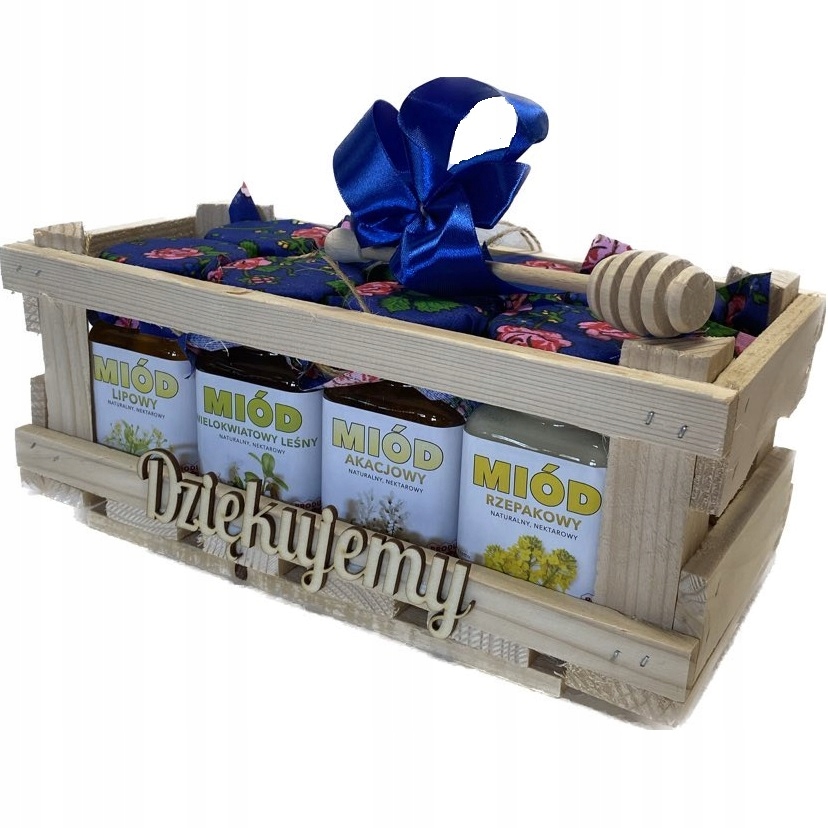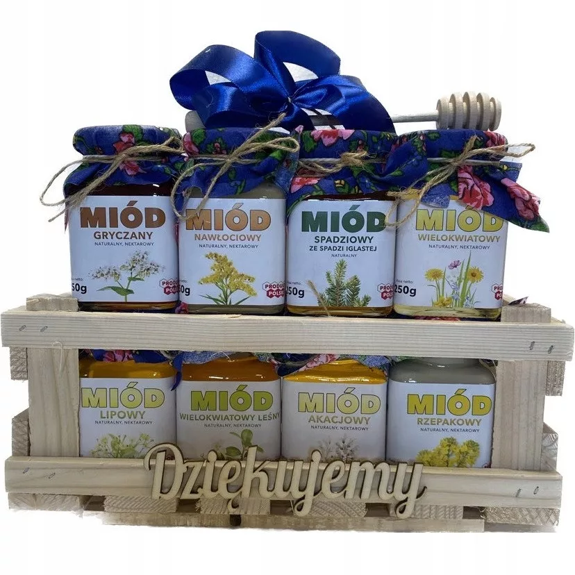 Wszystkie miody są ubrane ozdobnym niebieskim materiałem i spakowane do drewnianej skrzyneczki.