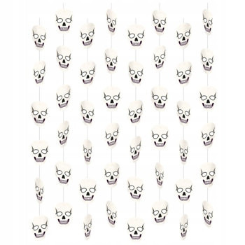 Dekoracja pionowa, wisząca z przyczepionymi czaszkami. Czachy wykonane są z tworzywa oraz przyszyte do żyłek. Opakowanie zawiera8 sznurków z dekoracjami, które mogą być zawieszone niezależnie od siebie w pionie lub poziomie.